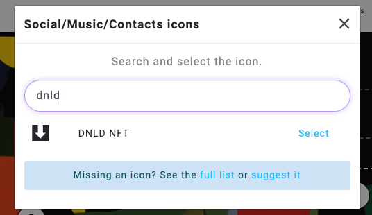 From your LNK.BIO dashboard navigate to style and look for add icon. Type in DNLD to search and select the icon. DNLD NFT will pop up.